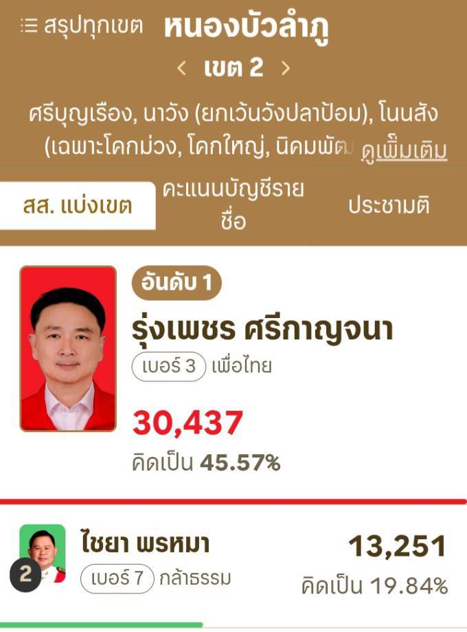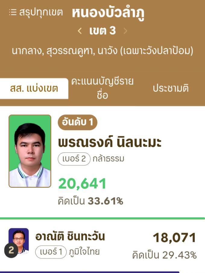 สรุปผลคะแนนการเลือกตั้ง สส.ทั้ง 3 เขต ของจังหวัดหนองบัวลำภู (อย่างไม่เป็นทางการ)